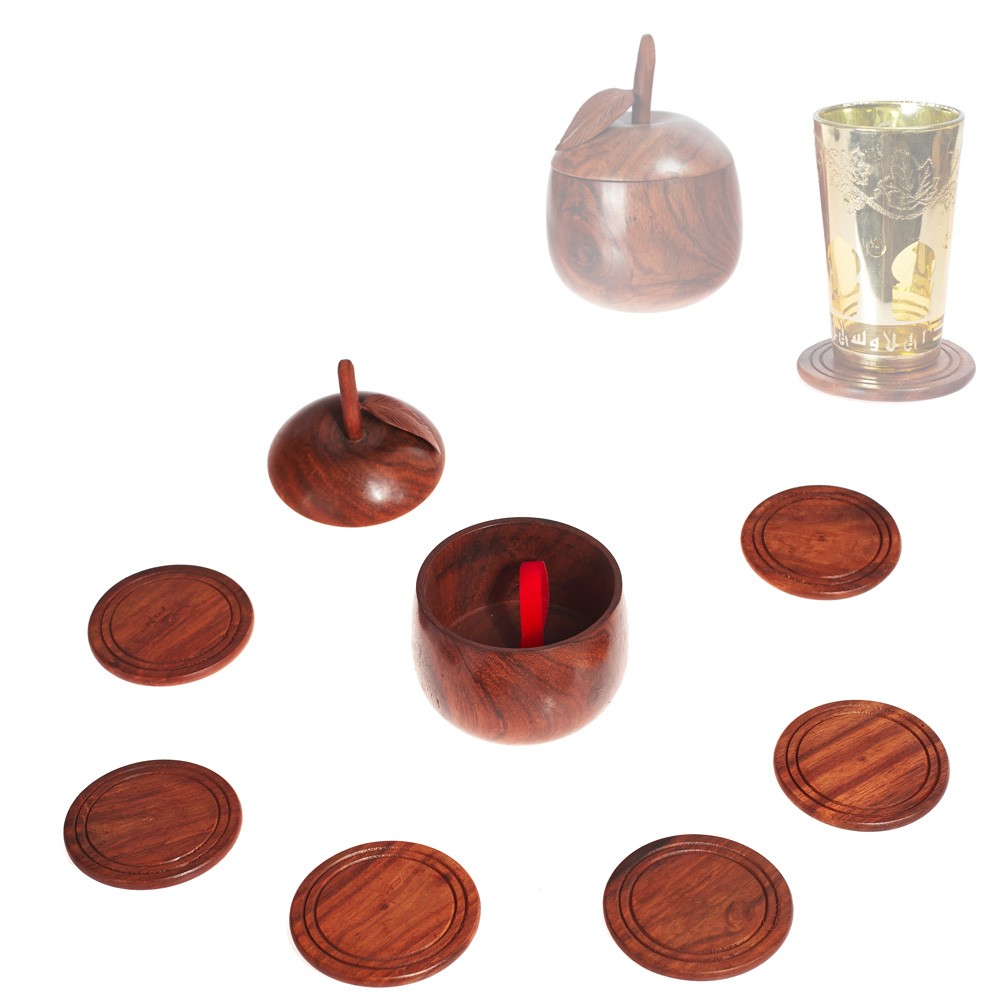 Juego de 6 posa vasos de madera realizados artesanalmente. Se guardan en funda de manzana de madera, muy original.Medidas manzana: 9 x 12 cm