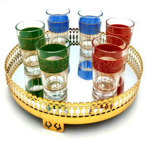 Set o juego de 6 vasos de te estilo Marroquí, ideal para tomar te verde con hierbabuena o cualquier tipo de te o infusiones. Muy bonitos decorado con ribetes dorados y colores. Juego de vasos de te ideal para regalar o para decorar su casa al estilo árabe.