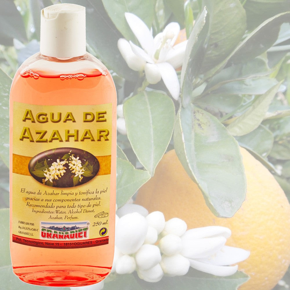 El Agua de Azahar limpia y tonifica la piel gracias a sus componentes naturales. Recomendado para todo tipo de piel. Disponible en 250 ml o 1 litro.