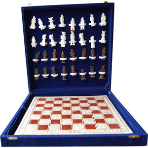 Ajedrez artesano completo. Tablero hecho con la técnia de la taracea en Siria. Fichas hechas en hueso. Caja forrada exteriormente en terciopelo.