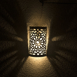 Decorada con el calado artesanal típico de marruecos, creando formas geométricas y florales, muy bonito y le dará una luz muy agradable y relajadora, perfecto para aplique de entrada o pasillero. Para decorar al estilo Andalusí en un patio, quedara bonito incluso de dia.
