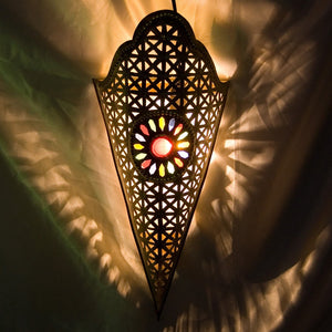 Aplique dorado de bronce calado. Decorado con resinas de colores. Crea un juego de colores muy agradable y decorativo. Artículo de 1ª calidad realizado artesanalmente. Medidas: Pequeño: 35 x 20 cmGrande: 46 x 21 cm.