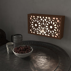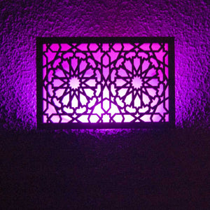 Aplique o plafón cortado por láser para pared, de madera y metacrilato. Diseñado para dar luz de ambiente para decoración árabe, morisco andalusí, marroquí.
