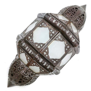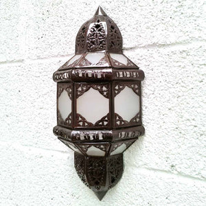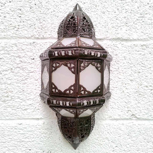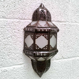 Aplique pantalla para pared marroquí estilo Andalusí decorado con chapa calada y cristal Blanco translucido, realizado artesanalmente en Marruecos.