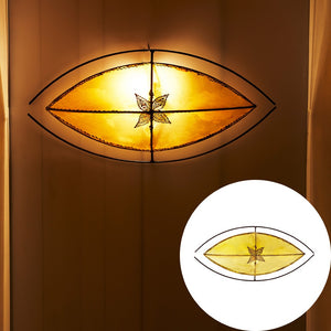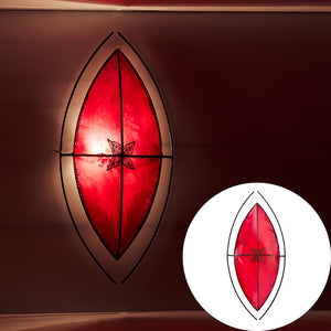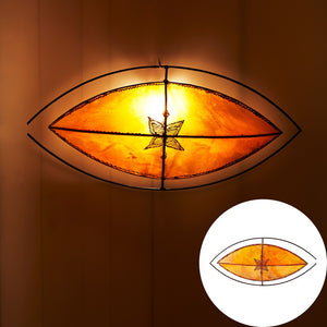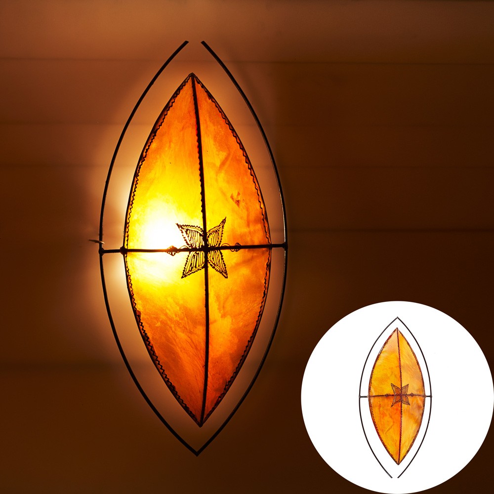 Aplique escudo africano realizar artesanalmente mediante piel, forja.Decorado con dibujos étnicos mediante henna natural.Producto muy original y elegante.Se puede colocar vertical o horizontalmente.Es una pantalla, es decir se coloca sobre un punto