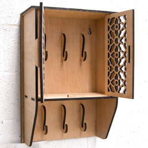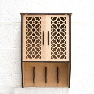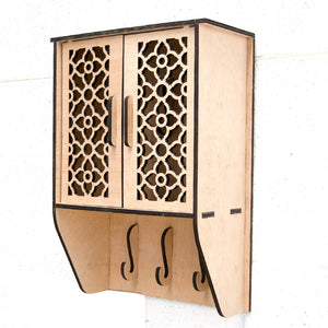 Armario o mueble para la entrada de la casa para dejar objetos o golgar ropa, perchero con hueco para dejar obletos. Decorado con celosia cortada por laser.