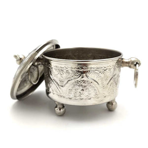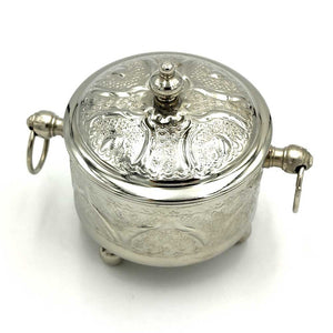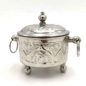 Azucarero Marroquí de alpaca con asas realizado artesanalmente y decorado con motivos árabes, para conjuntar con su juego de té.