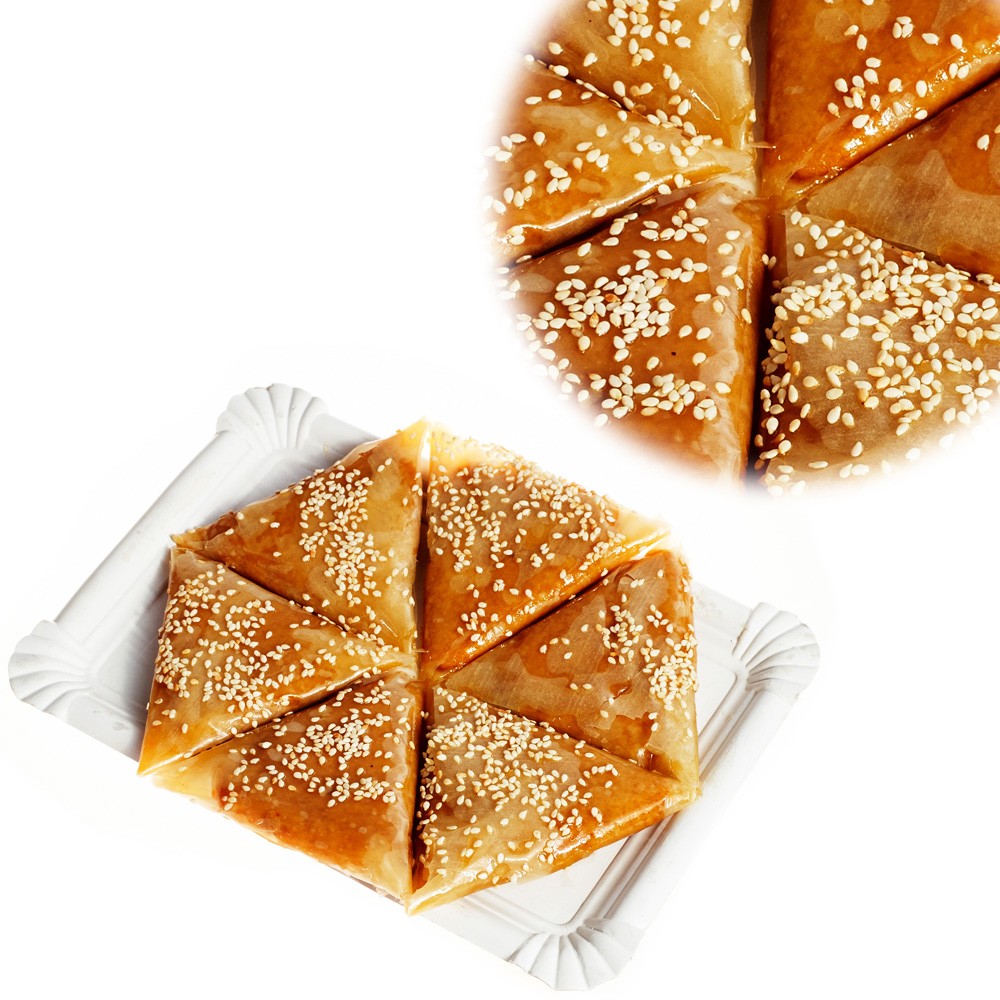 Bandeja con 6 triángulos de almendra y sésamo. Este producto es uno de los mejores que disponemos, su textura es parecida a la del turrón pero no tan pesado, recomendado.Pasteles árabes de primera calidad fabricados por pasteleros andalusís en