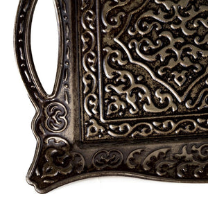 Bandeja turca elaborada en metal con grabados florales, elegancia y brillo espectacular.