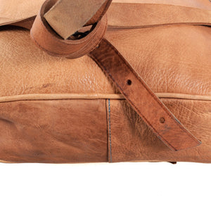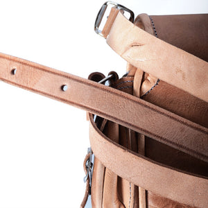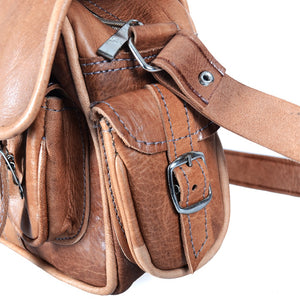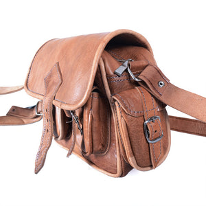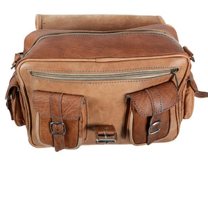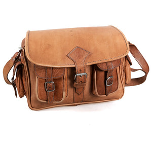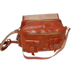 Bolso de cuero realizado artesanalmente. Dispone de 6 bolsillos: 2 externos laterales, 2 externos frontales, uno interno con cremallera y el principal interno. Producto de gran calidad muy bien acabado. Correa ajustable. Disponible en 2 colores (marrón camel y marrón oscuro). Medidas: Pequeño: 25 x 20 cm. Grande: 25 x 30 cm.
