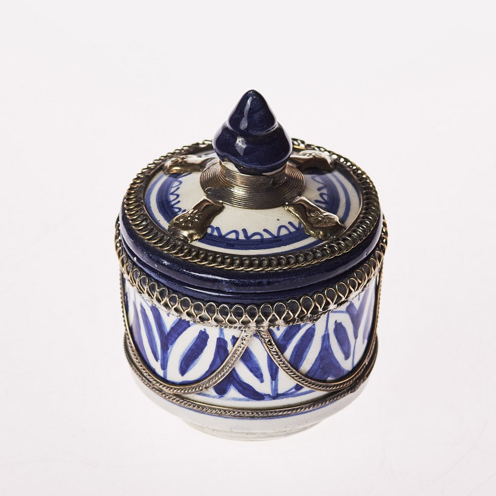 Bombonera cerámica realizada artesanalmente en cerámica y alpaca.Producto de gran calidad muy bien acabado