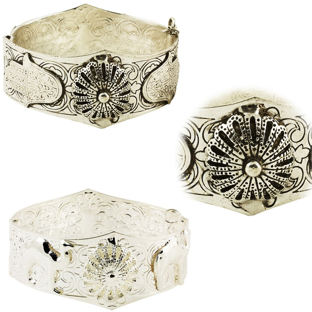 Brazalete de alpaca modelo mano de Fátima con camellos en relieve realizado artesanalmente con un acabado inmejorable.Se abre por la mitad para colocarlo con un cierre de bisagra en una lado y cierre manual por el otro extremo.Disponible en acabado