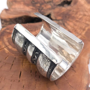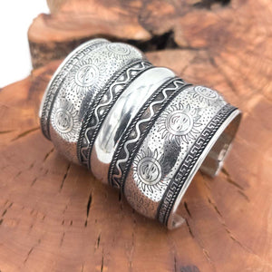 Brazalete de metal ancho tibetano con diseños mandala. Sol Indu. Artesanía India.