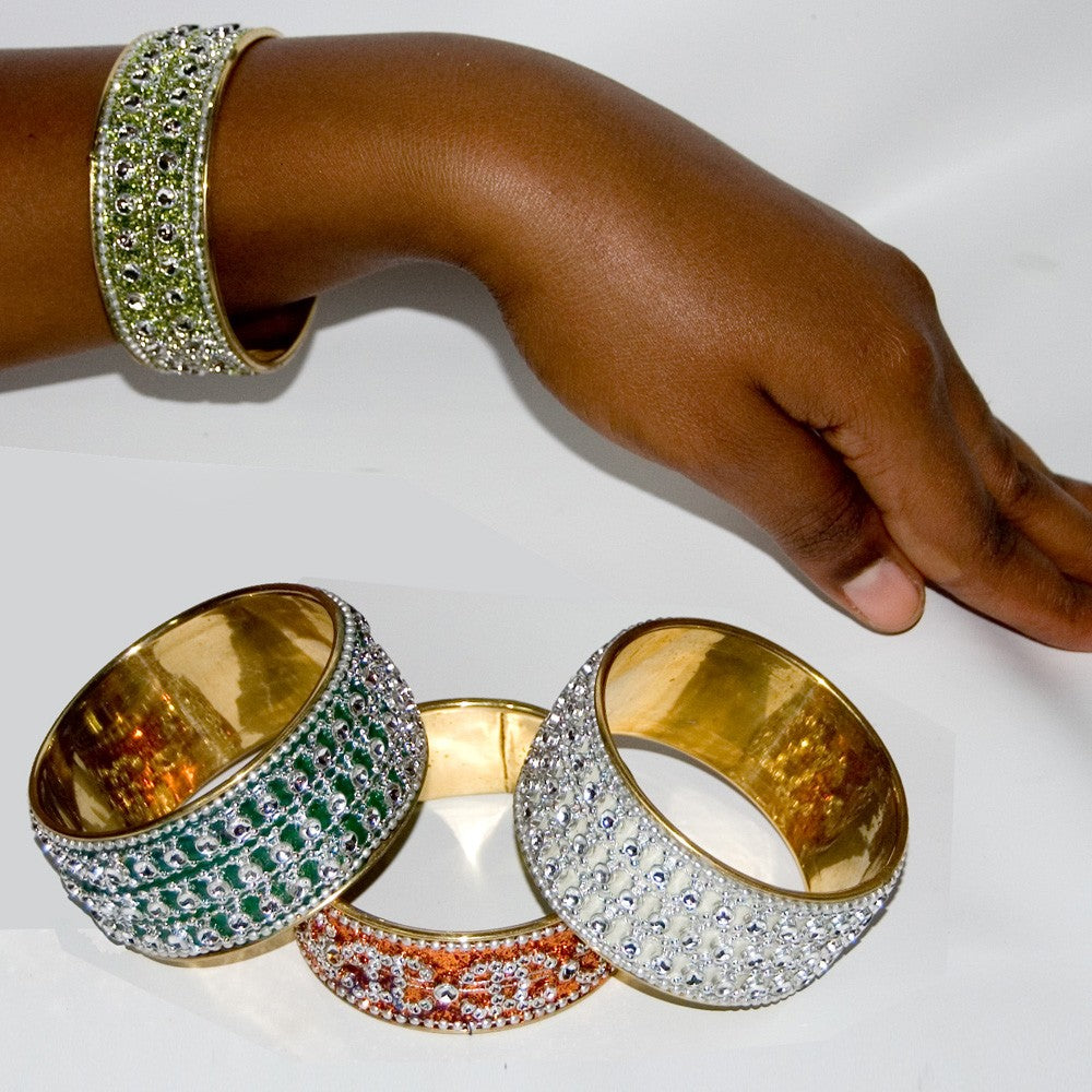 Brazalete dorado con brillantes. Disponible en varios colores. El color cobre y verde pistacho miden 3 cm de ancho.
