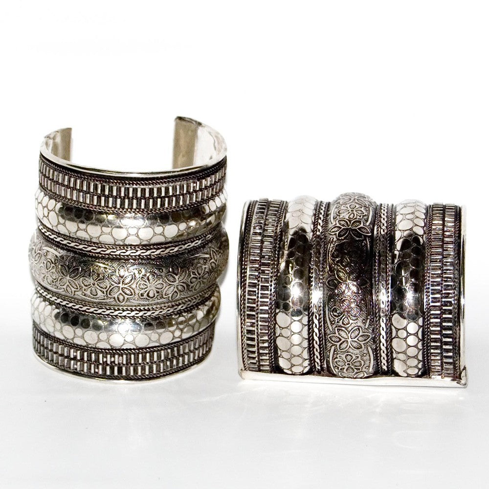 Brazalete plateado ancho con grabado. Diseño floral.