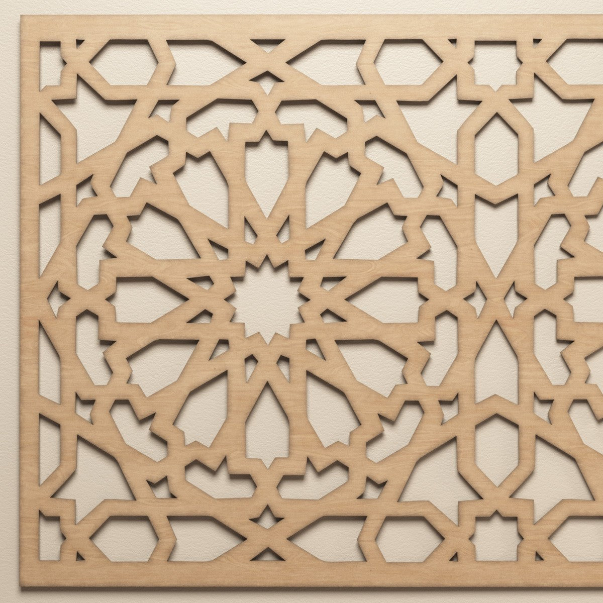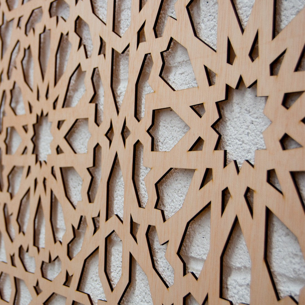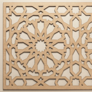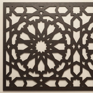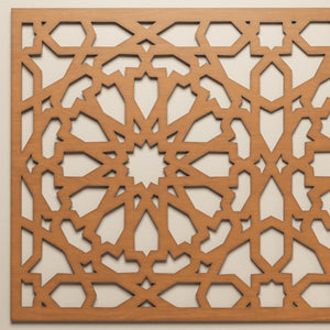 Cabecero de cama realizado en madera con diseño celosía de la Alhambra. Inspirado en las cenefas, mosáicos y diseños geométricos de Alhambra y Generalife.