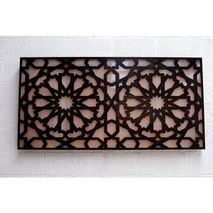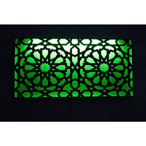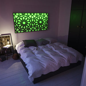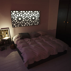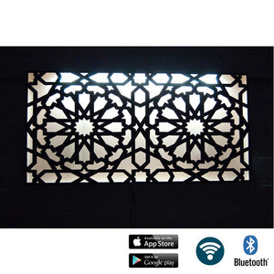 Cabecero de cama Celosía Arabe modelo Alhambra retroiluminado con luz led RGB+White, control por mando a distancia y conectable al móvil mediante bluetooth.