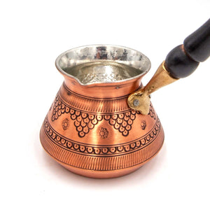 Cada cafetera ha sido cuidadosamente fabricada a mano por artesanos expertos, utilizando técnicas tradicionales transmitidas de generación en generación. El cobre grabado le confiere un aspecto elegante y distintivo, mientras que el mango de madera ofrece un toque de calidez y comodidad durante su uso.