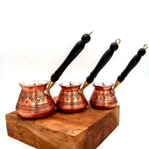 Cafetera Turca Cezve Artesanal de Cobre Grabado con Mango de Madera - Juego de 3 Tamaños