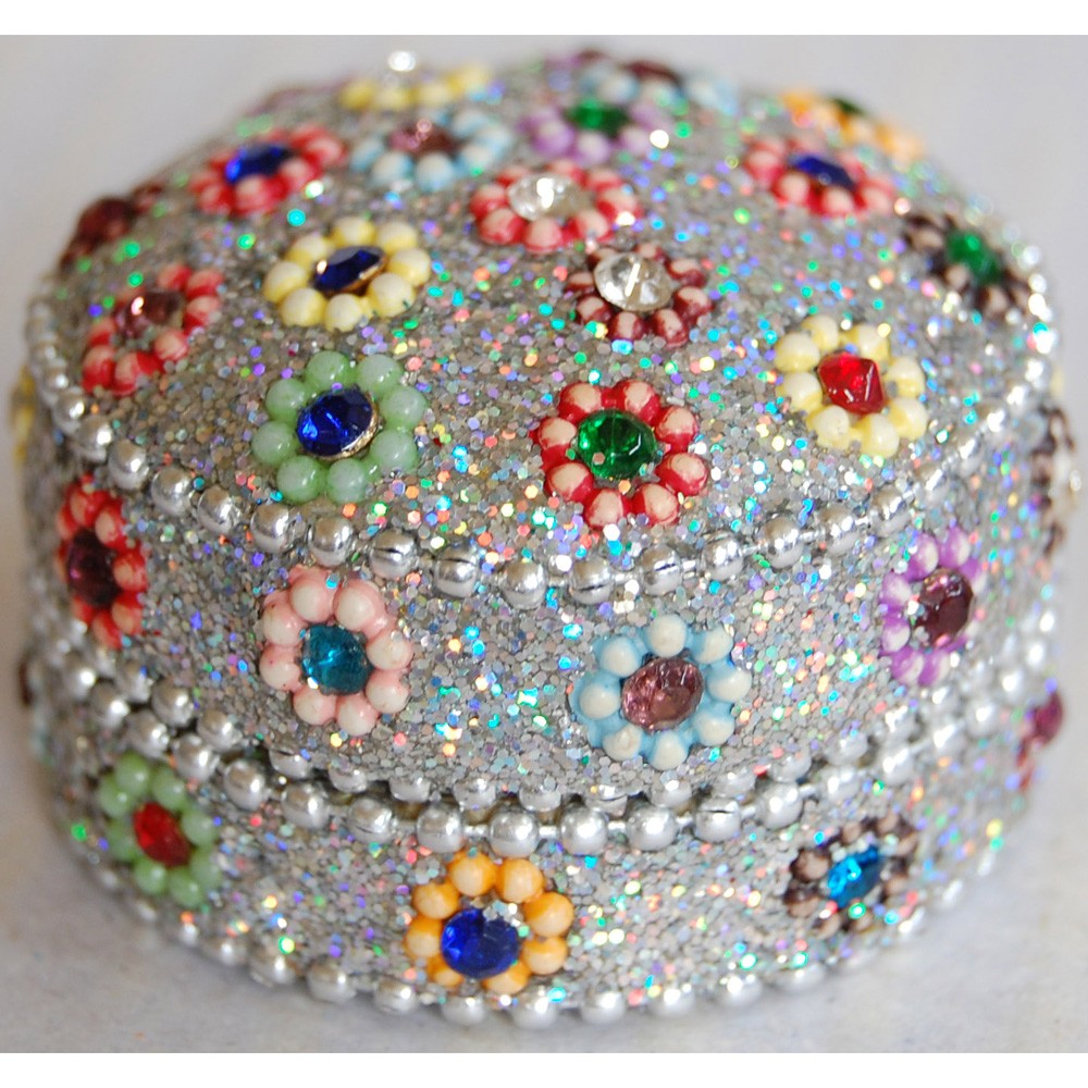Caja brillante redonda con incrustaciones de colores. Forrada en terciopelo. Medidas: 4´5 x 3 cm.