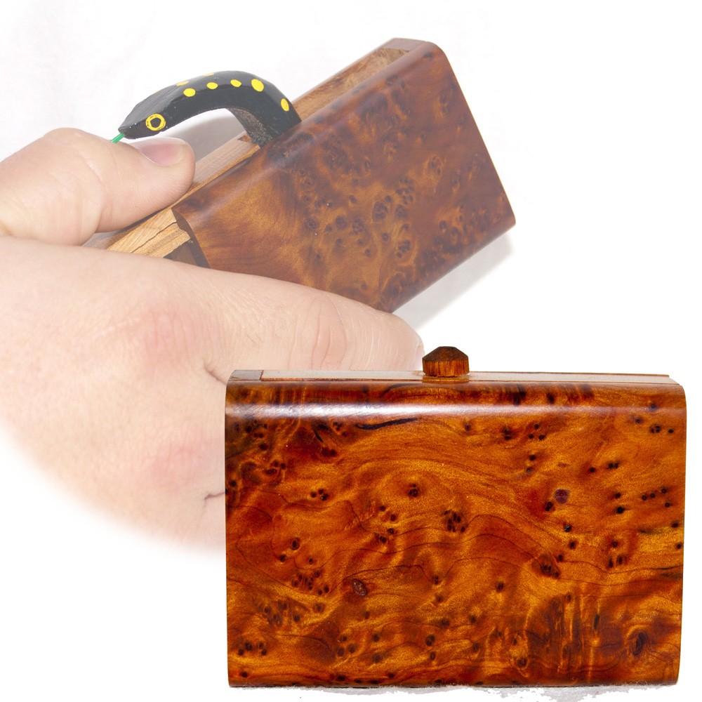 Caja serpiente sorpresa, al abrirlo sale una serpiente y te pica en el dedo.Ideal para bromas y dar un susto.Realizado artesanalmente en raíz de tuyya (madera de sabina), caracterizada por su belleza y olor.Medias aproximadas: 8 x 5,5 x 3 cm