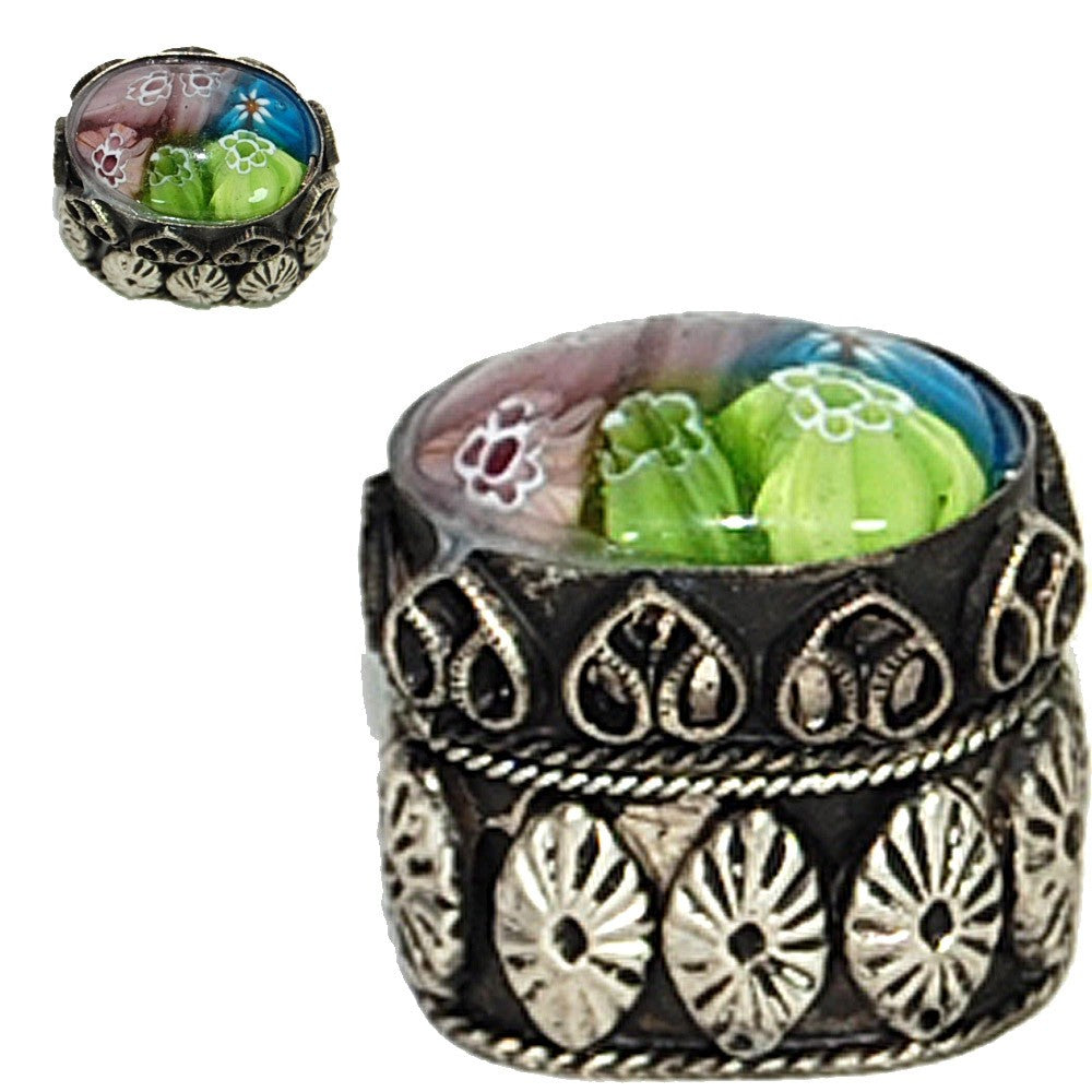 Cajita alpaca mini grabada con relieves orientales. Por dentro no está forrada por lo que se puede utilizar a parte de como pastillero también para cremas, perfumes sólidos,etc. 3 x 2 cm.