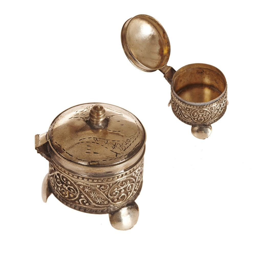 Caja realizada artesanalmente en alpaca grabada con relieves florales.Muy bonita y bien acabada.Medidas: 6 cm alto x 4 cm diámetro.