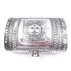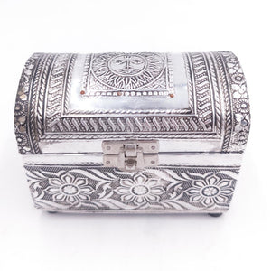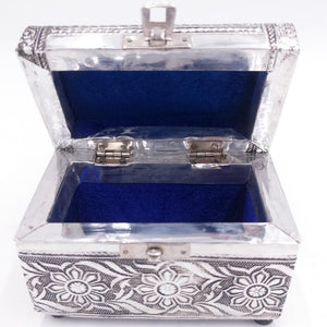 Cajita con forma de baúl. Fabricado artesanalmente en alpaca, forrada con terciopelo. Perfecta para regalo.