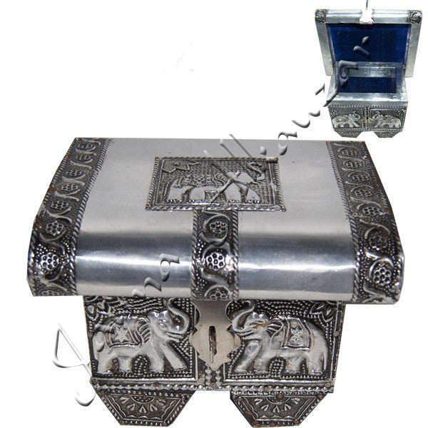 Cajita con forma de baúl. Fabricado artesanalmente en alpaca, forrada con terciopelo. Perfecta para regalo.