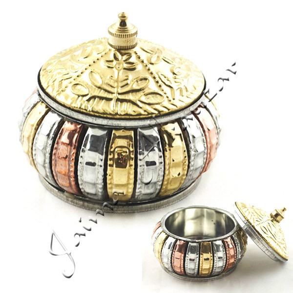 Cajita de bronce con relieves florales decorada en 3 colores. Muy bonita y bien acabada. Ideal para guardar objetos pequeños, pastillas, etc. Medidas: 7,5 diámetro x 6 cm alto.