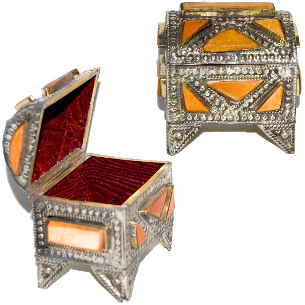 Cajita de alpaca y hueso naranja. Forrada interiormente con terciopelo. Muy bonita y bien acabada. Medidas: 8 x 8 x 6 cm.