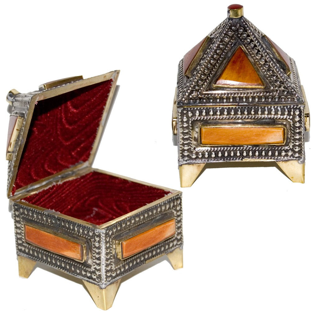 Cajita de alpaca y hueso naranja. Forrada interiormente con terciopelo. Muy bonita y bien acabada. Medidas: 7 x 7 x 9,5 cm.