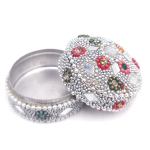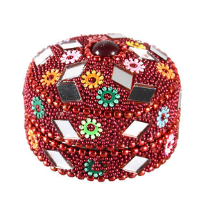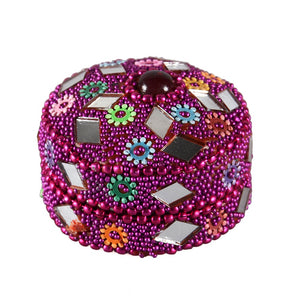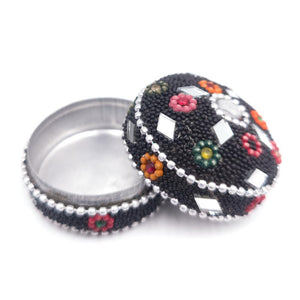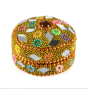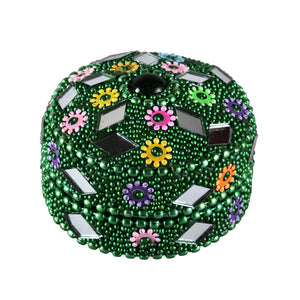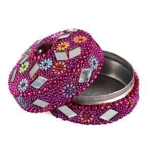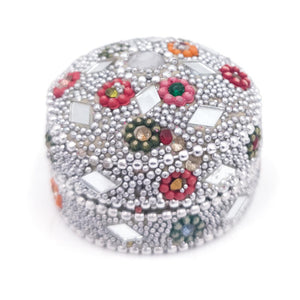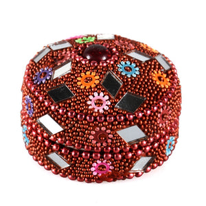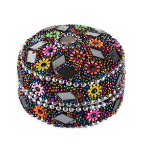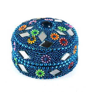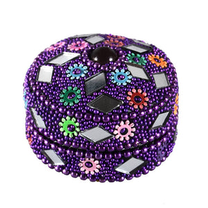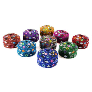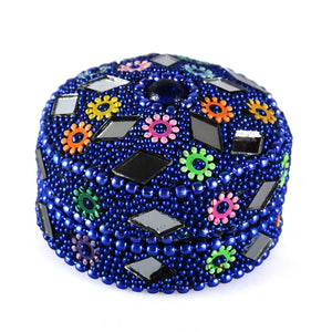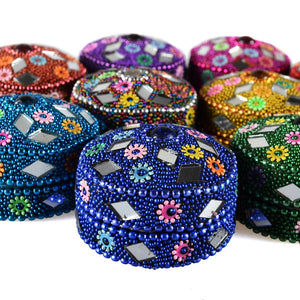 Cajita redonda con incrustaciones brillantes de colores. Ideal para guardar perfumes ya que el interior es metálico y no forrada en terciopelo como otros modelos.Disponible en varios colores. Perfecta para regalo.