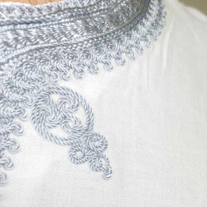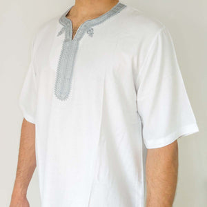 Esta bonita camisa Marroquí bordada al estilo árabe andalusí tienen color blanco con bordados grises. Disponible en en varias tallas, Ideal para vestir en verano ya que la tela es muy agradable, la tela queda suelta lo que favorece la transpiración.