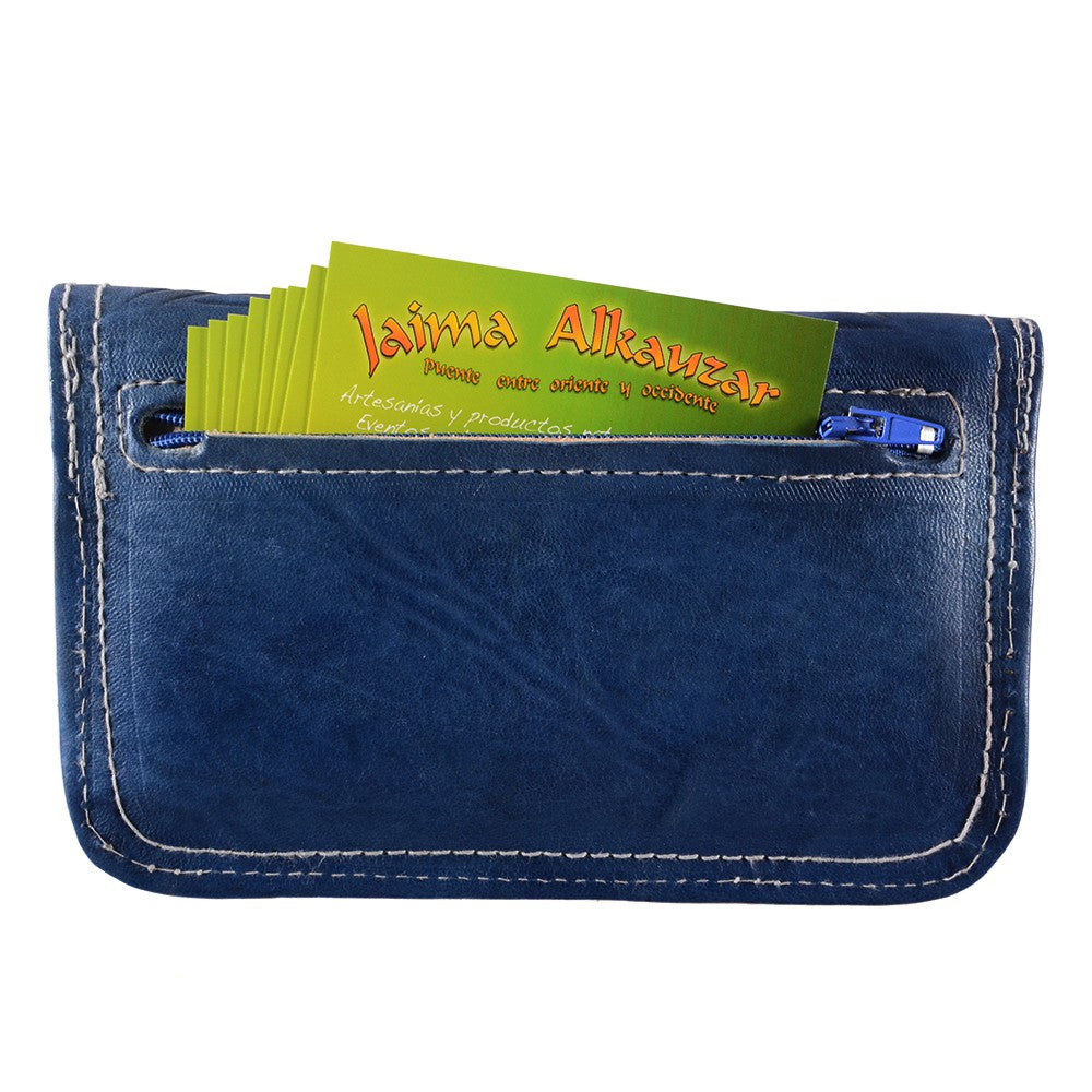 Cartera billetera de piel grabada y acolchada realizada artesanalmente con cremallera trasera.