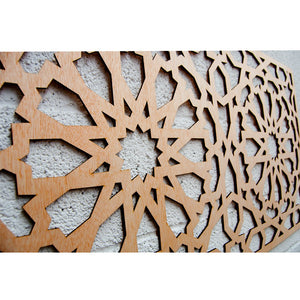 Celosía de madera inspirada en las cenefas y diseños geométricos de Alhambra y Generalife.