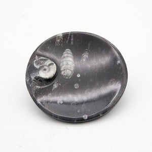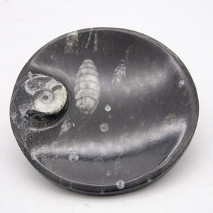 Cenicero o porta objetos, hecho con ortosera y amonites pulidos.