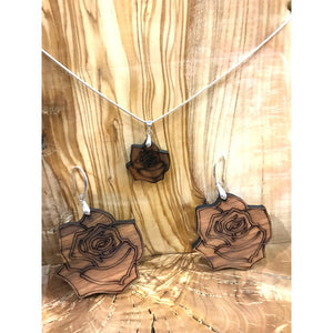 Conjunto Colgante y Pendientes Rosa - Madera de Olivo con Plata