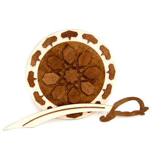 Conjunto de escudo con espada andalusí realizado en madera laminada.