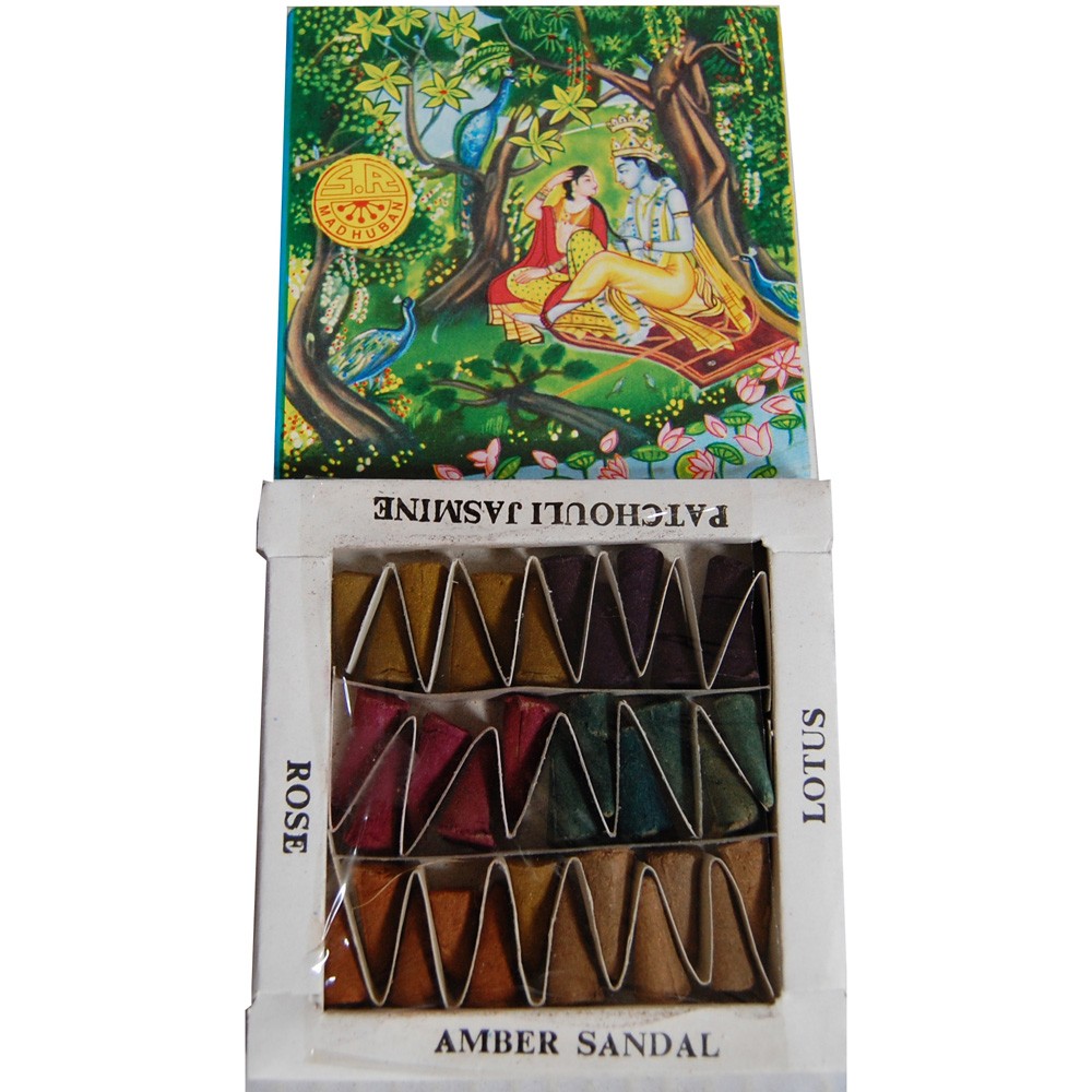 Conos de incienso MADHUBAN. 6 olores: Jazmín, patchuli, rosa, ámbar, sándalo, lotus.