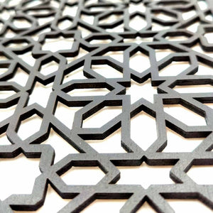 Celosía Árabe de madera laminada de 4 mm cortada por laser, con diseños geométricos. Ideal para la decoración árabe, morisca, andalusí de cualquier mueble, mesas, sillas, armarios, o para la decoración de cenefas, paredes, zócalos, techos, puertas....
