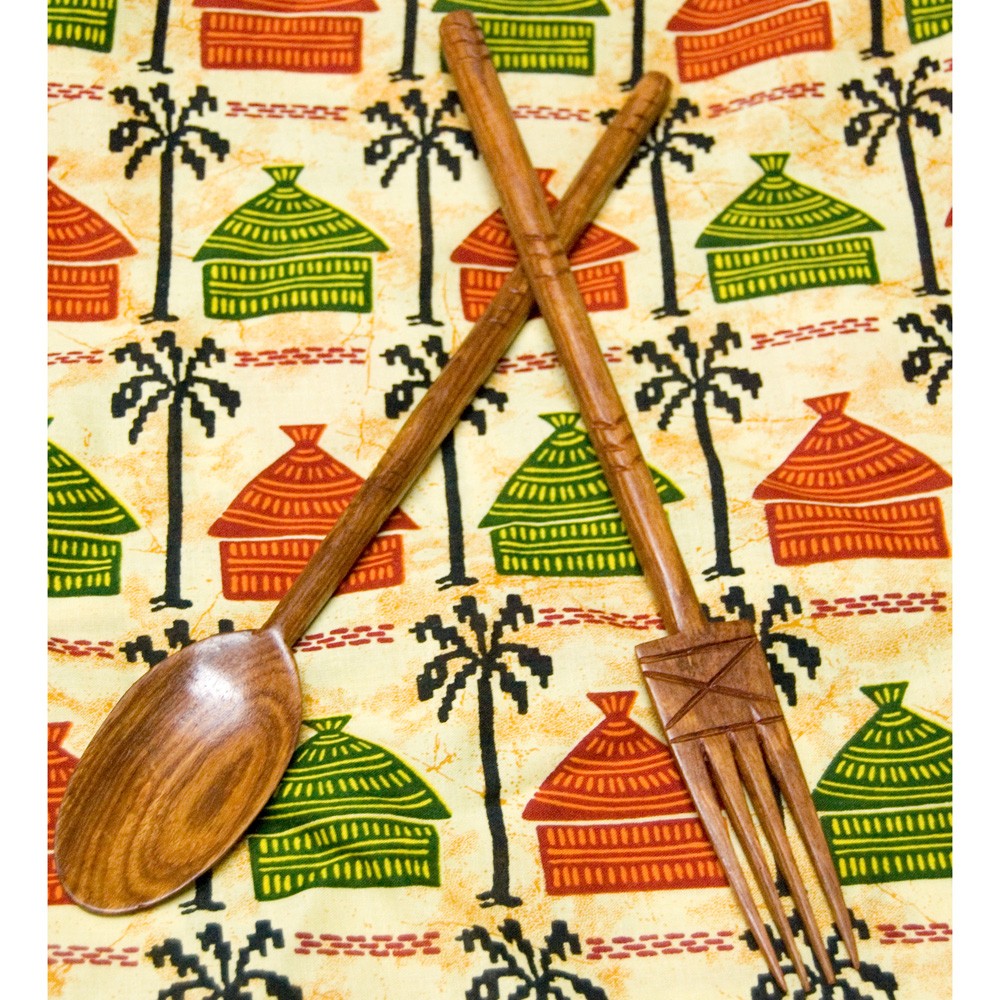 Cuchara y tenedor africanos. Tallados y grabados artesanalmente en madera roja de teka. Muy bonitos. Largo: 35 cm