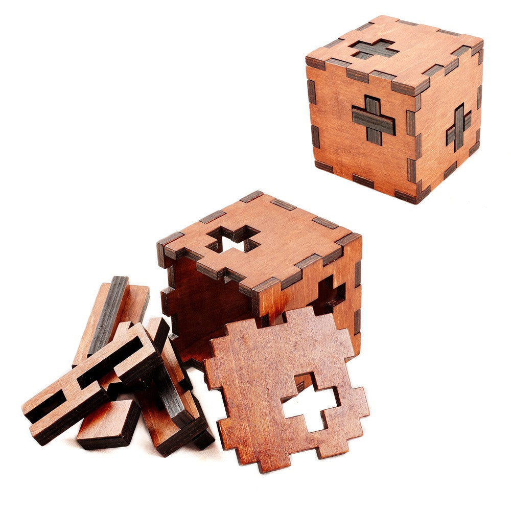 Cubo puzzle ingenio desmontable completamente.El cubo se desarma completamente, hasta las paredes también. Luego tenemos que montarlo de nuevo, hasta hay fácil, lo difícil viene ahora. Tenemos que introducir 3 cruces de madera entre sí dentro del