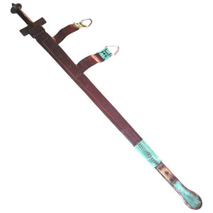 La funda está hecha en cuero y tiene anillas para colgar la espada.