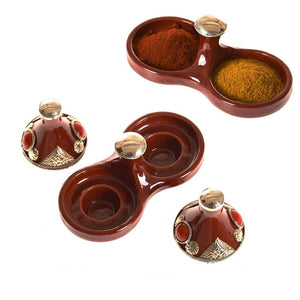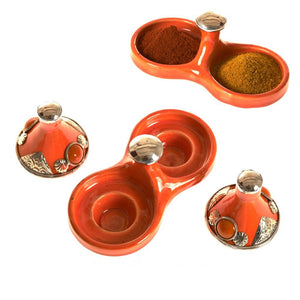Tajin mini especiero doble realizado artesanalmente en cerámica esmaltada, decorado con alpaca y hueso.Ideal para presentar especias como sal, pimienta o comino.Muy elegante en la mesa, sobre todo para platos árabes.Disponible en varios