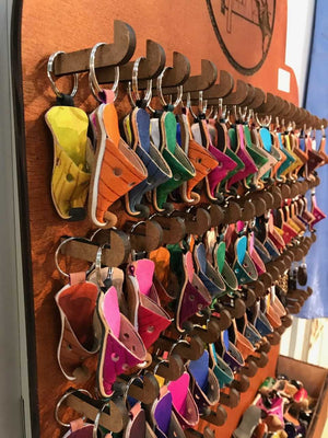 El material usado para el expositor es panel de madera okumen de 1 cm de grosor. Para los ganchos se ha usado madera DM de 5 mm.