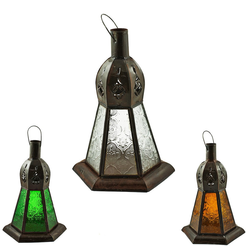 Farol hexagonal con cristales de colores.