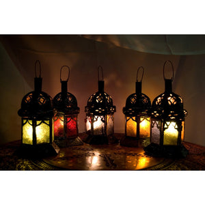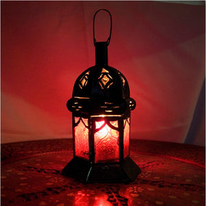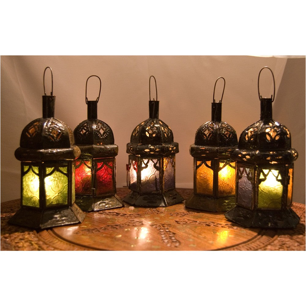 Farol hexagonal de cristal para vela. Disponible en 5 colores: azul, verde, naranja, rojo y multicolor. Muy bonitos.