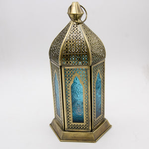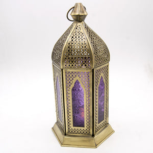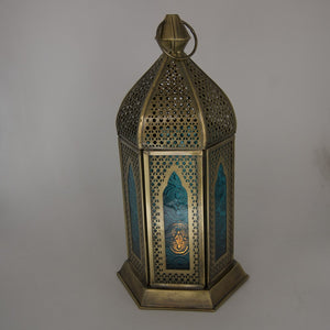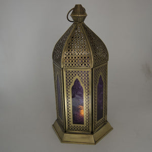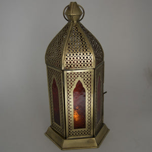 Farol para velas realizado artesanalmente. Con motivos árabes, fabricado en metal muy resistente y cristal de colores lisos.