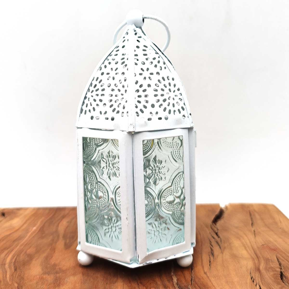Añade elegancia y calidez a tu hogar con este farolillo árabe calado en blanco. Sus delicados cortes geométricos crean una atmósfera mágica, perfecta para cualquier espacio, tanto interior como exterior.